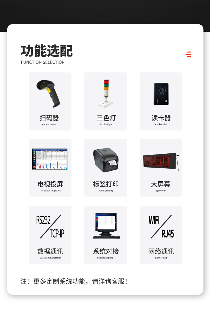 選配外設 | 三色報警燈、標簽/票據打印機、讀卡器、掃碼槍、大屏幕 |